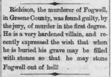 Richison, the murderer of Fogwell, in Greene County, was found guilty, by the jury, of murder in the first degree. He is a very hardened villain, and recently expressed the wish that when he is buried his grave may be filled with stones so that he may stone Fogwell out of hell!