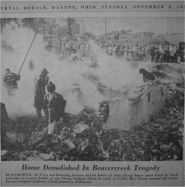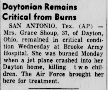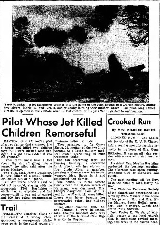 'A jet Starfighter crashed broadside into a house near here today and buried itself in the ruins. Two young sisters were killed. The pilot ejected to safety. The mother of the girls, Mrs Grace Shoup 37, ran from the house her clothing in flames after the supersonic craft crushed the house and exploded. She is in critical condition. The sisters were Lynn Shoup 12 and Laura 2. Their brothers, Billy 10 and Tommy 8, were in school. Lynn a was to have reported for her half-day session of school at noon. Their father was at work.