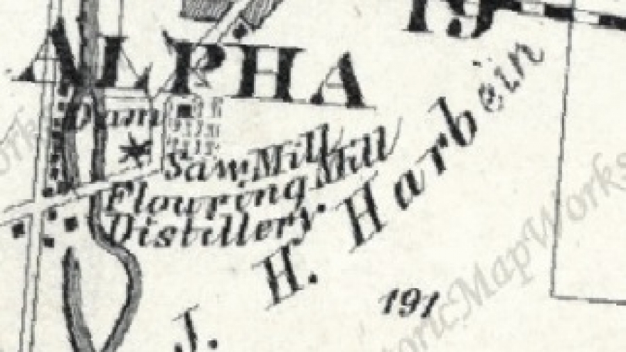 On the image above, you can see where the Beaver Creek was split to utilize a mill race, a regulated channel of water to power the water wheels of the mills. The square under the P in Alpha represents the Harbine home, surrounded by a fruit orchard. Between the mill race and Factory Road are 9 dots representing worker housing for the laborers to live in.