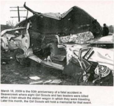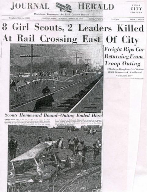 March 18, 1959 eight girl scouts eight Girl Scout and their two leaders were killed in a collision with a train. On March 18, 1959 the troop went to the Xenia Library to work on a badge. They were on their way back, crossing the railroad which intersected Factory Road when their car was hit by a freight train. All eight girls and the two adults died from the collision. The girls were in 6th grade all but one of them were twelve years old, one was eleven. This website contains pictures of a newspaper article from the crash http://www.rarenewspapers.com/view/574515.