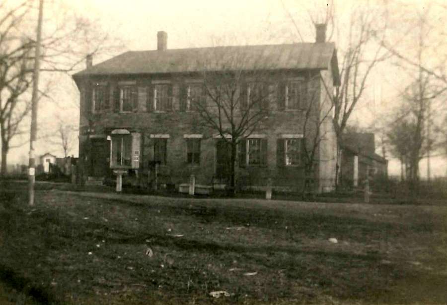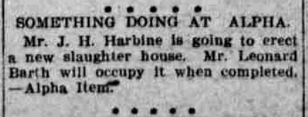 Enoch Needles and Baur Dice each began to erect their houses across the street from each other. The contest was an exciting one; and though Mr. Needles succeeded in getting the frame of his house up first, due to the rushed construction, it fell down the same night, giving Dice the opportunity of declaring that his was the first house built in the town of Alpha. Enoch Needles kept the first drygoods store in the home he built.