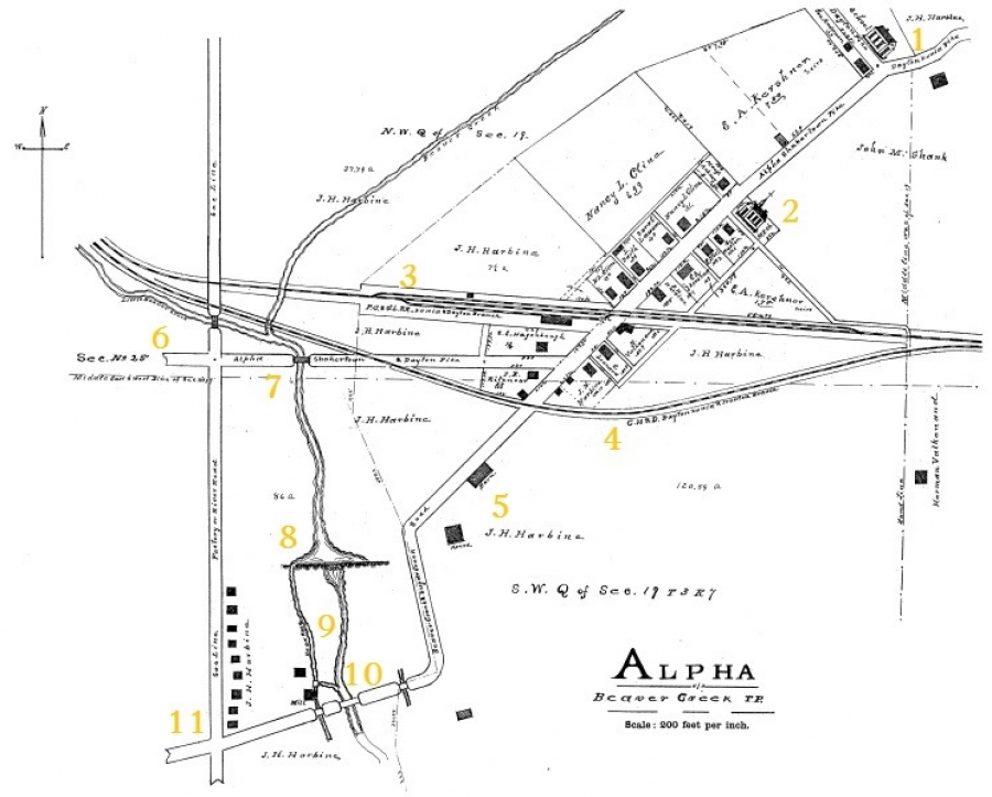 The undated map above shows an early map of Alpha as laid out by Harbine and Needles. Items of note: