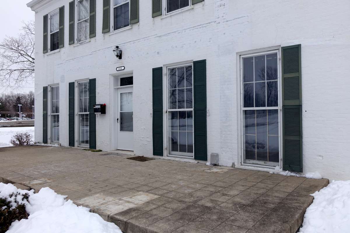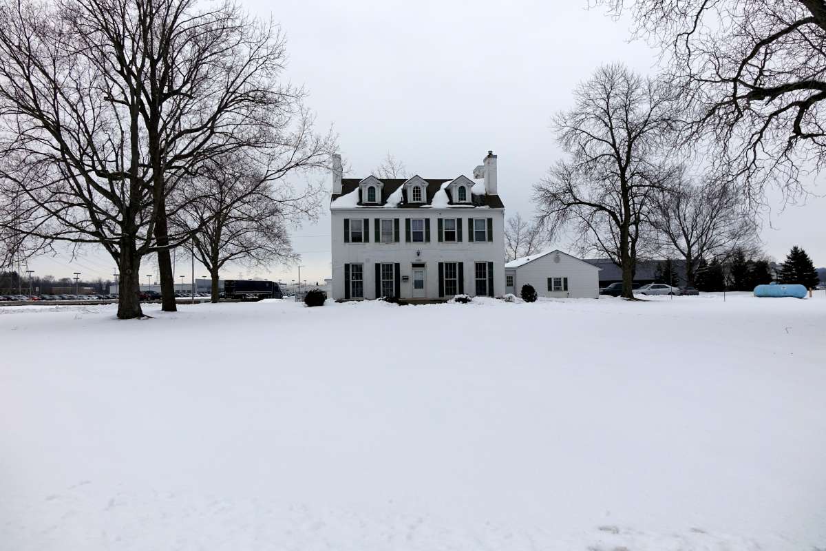 As you approach U.S. Route 35, prepare to head east on Heller Drive. Ahead of you was a lane that once traversed an orchard of over 300 fruit trees! The majestic Georgian Colonial home on the cul-de-sac across the highway, appropriately named Orchard Lane, was constructed by John Harbine for he and wife Hettie in 1832. Historical accounts conflict as to whether John and Hettie lived in the log cabin at its original location during the construction of the Harbine House. It might have been moved a short distance in 1825 to what eventually became the front yard of the new Harbine residence.