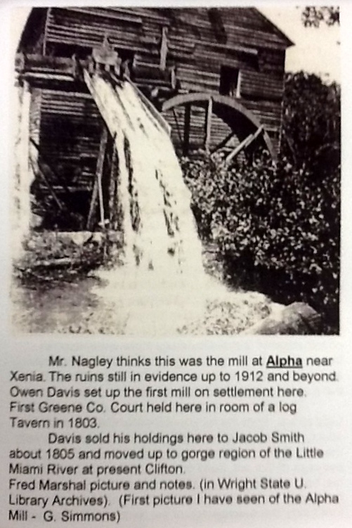 In the early 1850's John Harbine and William Needles laid out the town of Alpha along the newly built Dayton, Xenia, and Belpre Railroad. The village began to thrive when the railroad went through in 1853. A rivalry developed amongst the citizens as to who would put up the first house in the new town.