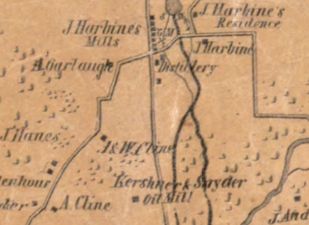 The bridge over the Beaver Creek is the approximate location of Mr. Harbine’s distillery. The mill dam, just north of the existing highway, divided a mill race from the main creek. With this rudimentary dam they could control the flow to the water wheels that powered the mills. Once the mill era passed, the new leg was filled in, and is somewhat viewable in the basin on the north side of the bridge.