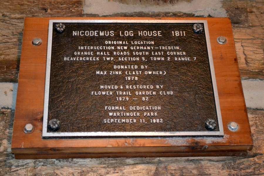 It was donated by Max Zink to the Flower Trail Garden Club in 1979 and moved to Wartinger Park. Originally located on the southeast corner of New Germany and Grange Hall Roads on property which was owned by the Zink family. The Zink family had moved there in 1932. For many years, the home was rental property , then it stood empty. Finally, the Board of Health issued a close order. In the process of tearing off the weather stripping, the old log cabin was discovered. Research showed that the cabin was built by John Nicodemus in 1811.