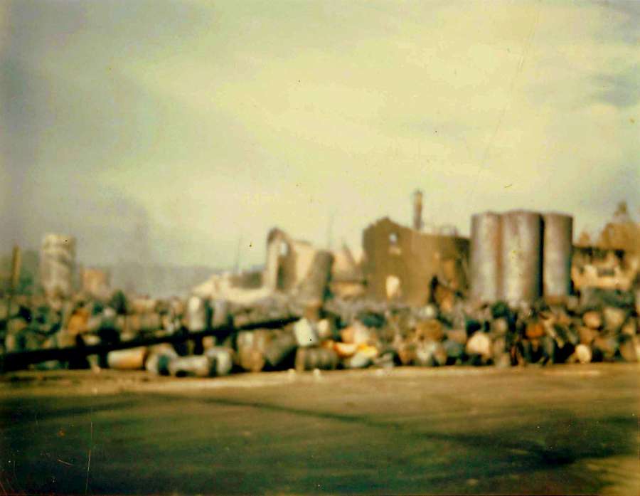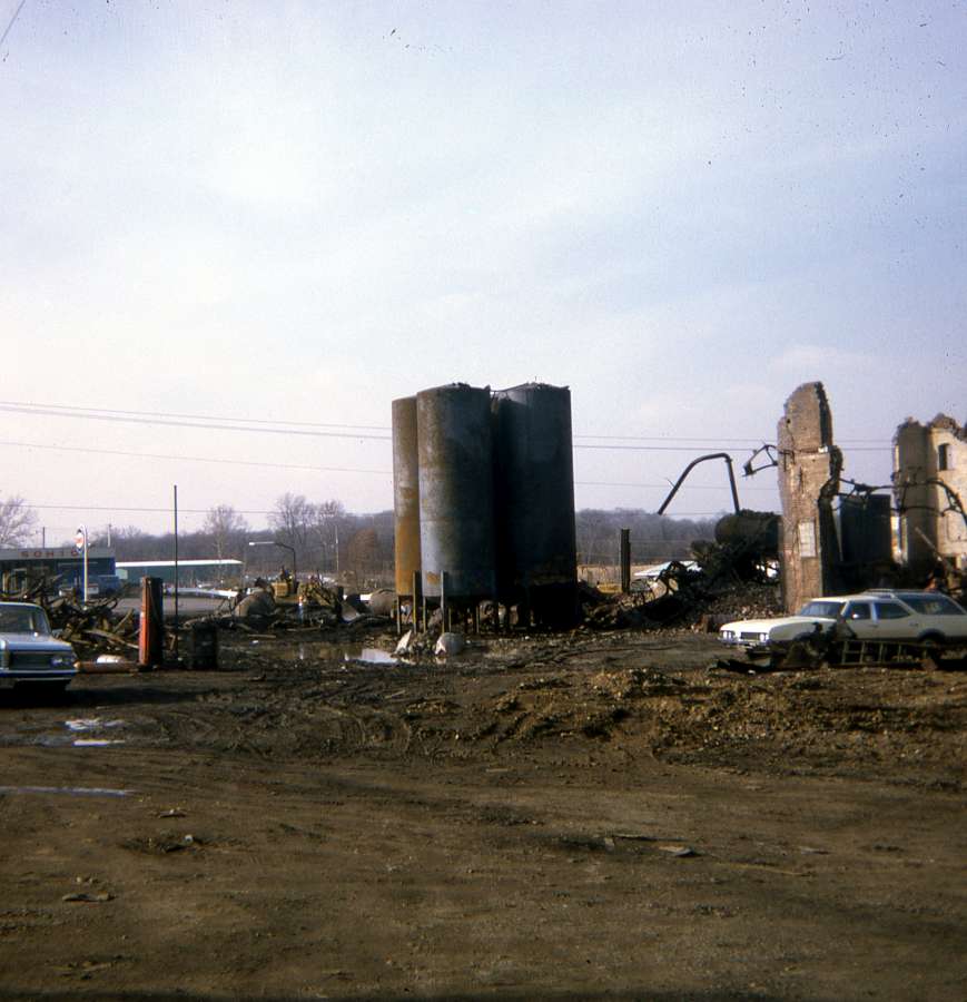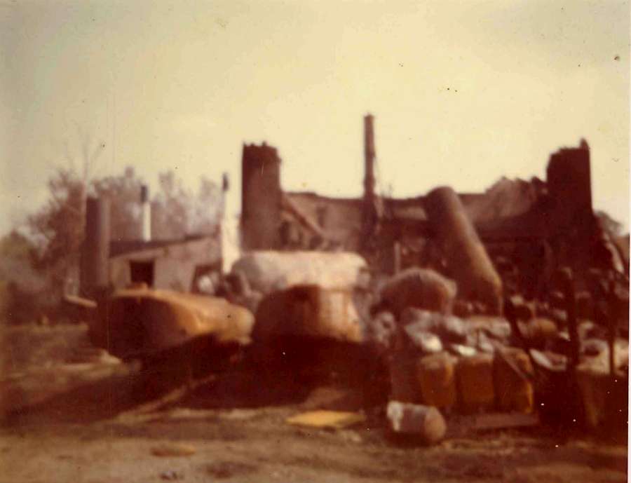 The next morning the chemical smell was strong in the area. Thousands of blackened barrels littered the ground. In the center of what was left of the factory two giant tanks remained. Three burned out tanker trucks were amidst the rubble and the fire still smoldered.