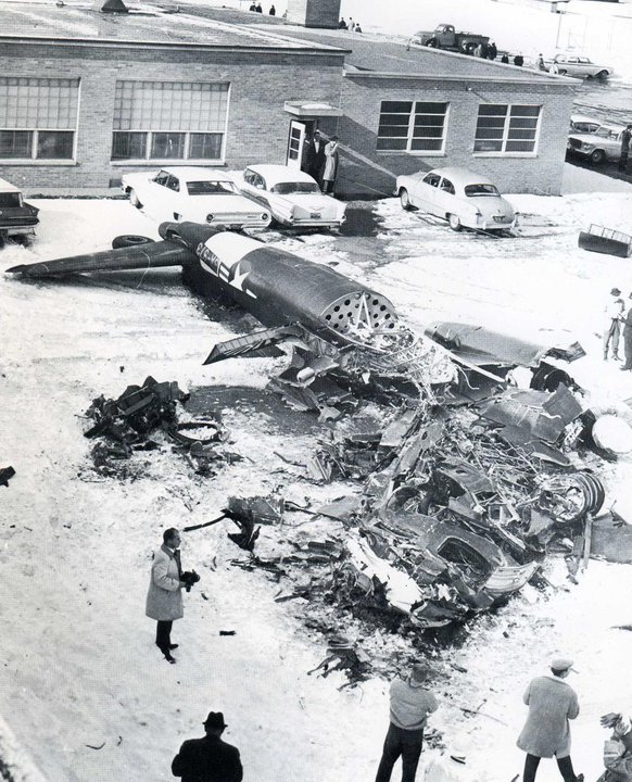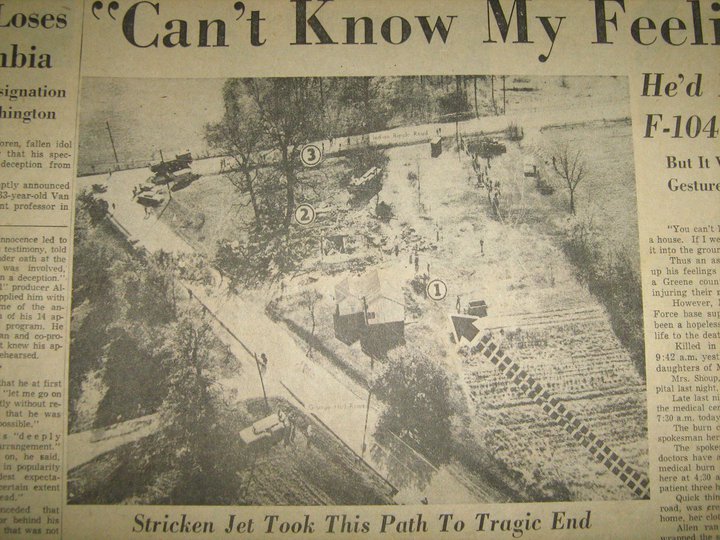 The plane spun through the air over a distance of 15 miles, landing only a few feet from the school building between the east wind and the east cafeteria narroly missing the cars parked there. The area and the manner in shich it crashed could olny mean that the last lap of its flight was almost straight up and down." Read more... |