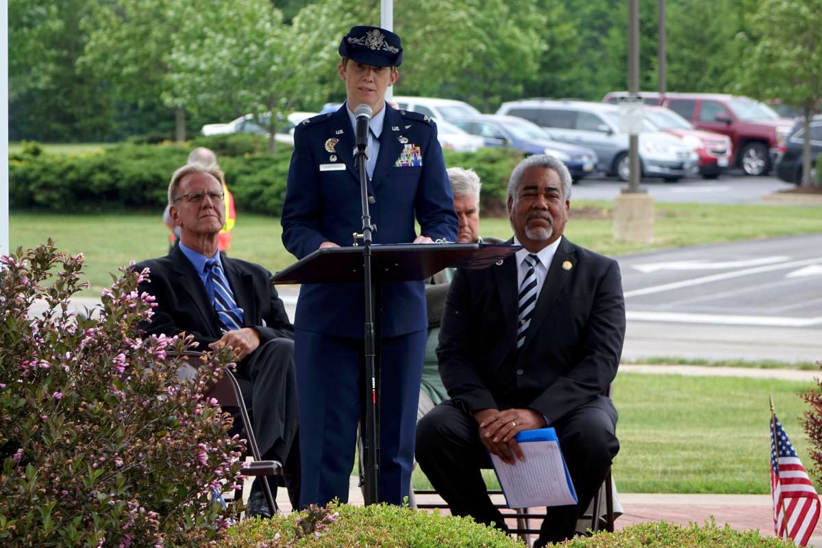 Sprinkles of rain greeted the playing of the bagpipes as well as the presentation of the colors, invocation and Mayor Jarvis' welcome, but the liquid sunshine gave way to a gentle breeze for guest speaker Colonel Leah G. Lauderback, Commander of the National Air and Space Intelligence Center.