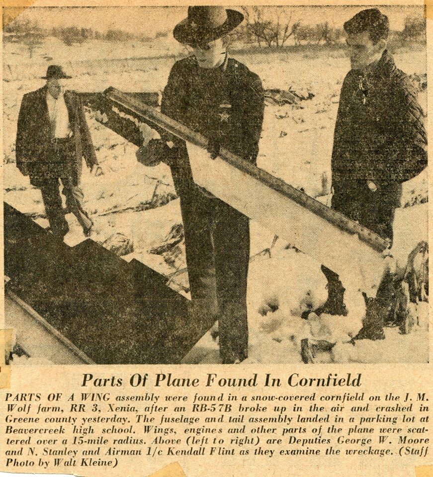 No one was injured and little damage was done, largely because there was no explosion due to the fuel having been contained in the wings. The pilot parachuted to safety. The engines landed miles away in a field on Shakertown Road and the wings were found near Fairground Road.