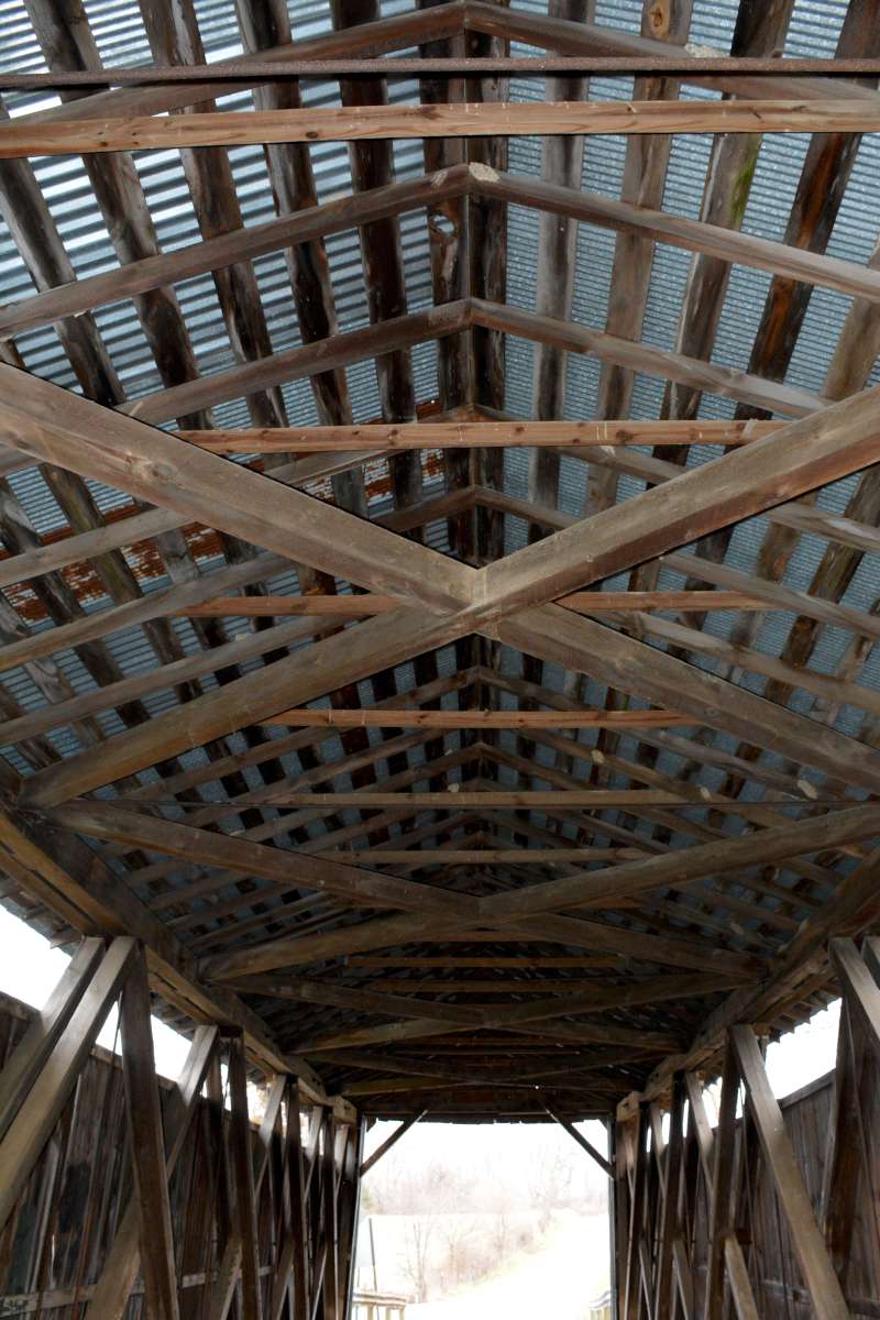 The Smith Bridge Company, builder of the Stevenson Road Covered Bridge, was extremely innovative for their time. They would perform a site evaluation, then measure, cut and build the bridge at their facility in Tipp City. Once perfected, the bridge would be cataloged and dismantled for transporting and reconstructing onsite - at a cost of $990 for this particular bridge. Evidence still remains on this bridge as you can easily spot the cataloging numbers in black paint on the bridges chords... numbers alone on the upstream side, numbers followed by a dash on the downstream side.