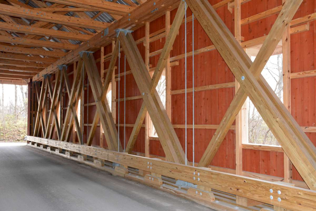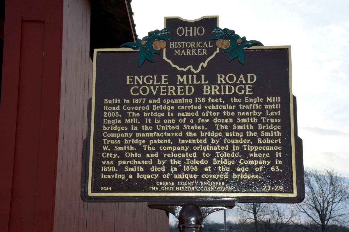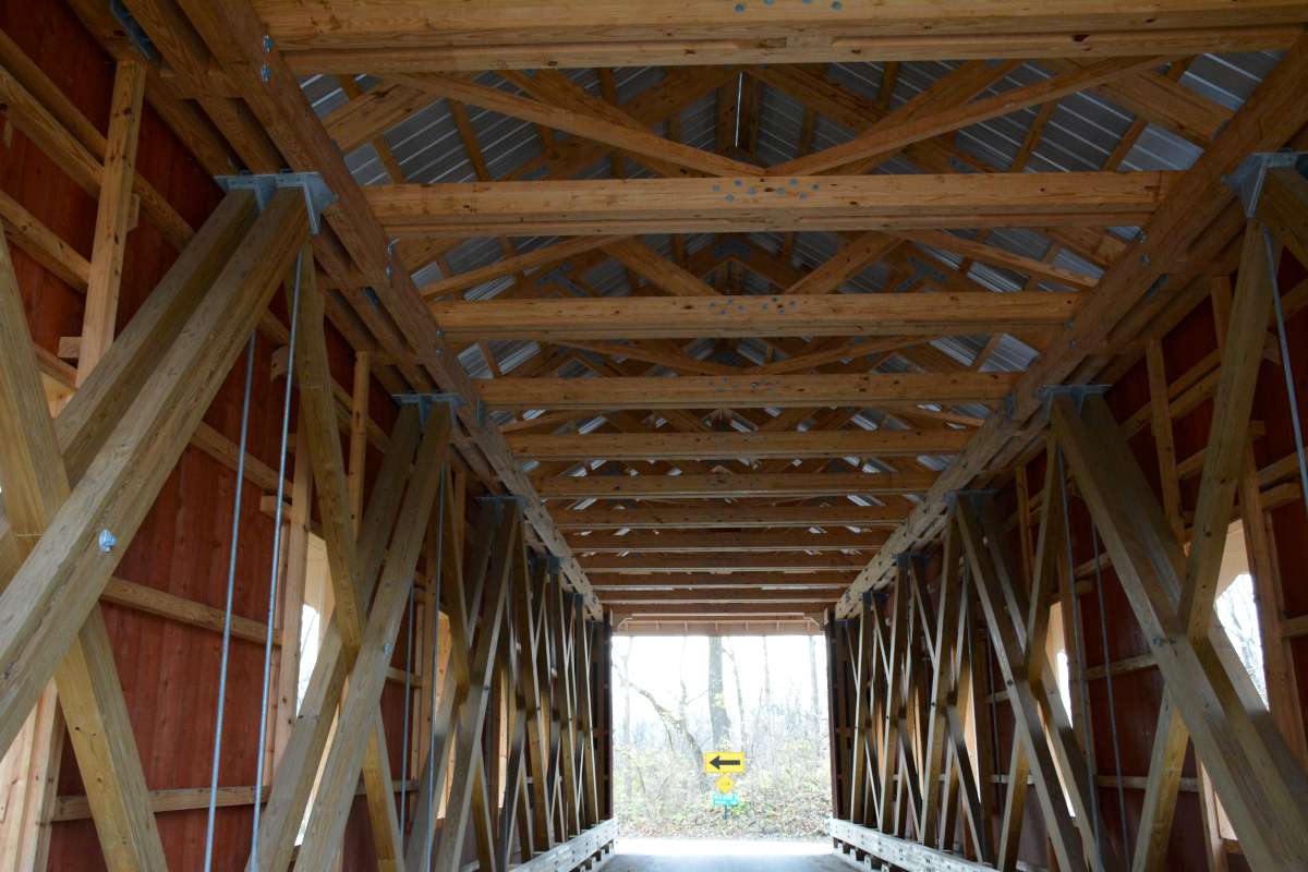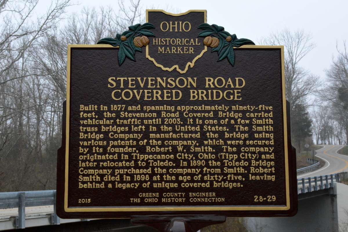 The bridge is a Smith Truss manufactured by the Smith Bridge Company. The company was originally located in Tippecanoe, Ohio - now Tipp City, before moving to Toledo in the 1880's to be closer to rail and water transportation. The innovator of the structure was Robert Smith, a master carpenter, who help patents on various parts of the structure. He was also believed to have been the first person in the country to prefabricate covered bridges. The Stevenson Road Covered Bridge is 96 feet in span over Massie's Creek and is the second Smith Truss restored by Greene County in the last couple of years. There are very few Smith Trusses left in the country and Greene County is blessed with two; the other being a 136 foot span on Engle Mill Road, which was completed in 2013. Engle Mill Road is one of the longest Smith Trusses remaining in the entire country. The Stevenson Road Covered Bridge is lit at night and has electronic (and neighborly!) surveillance. It is hoped that the people of Greene County will treasure these structures as they represent a rich transportation history that is local from fabrication to construction.