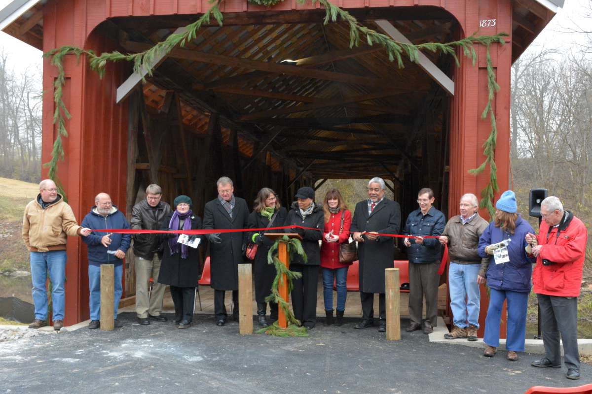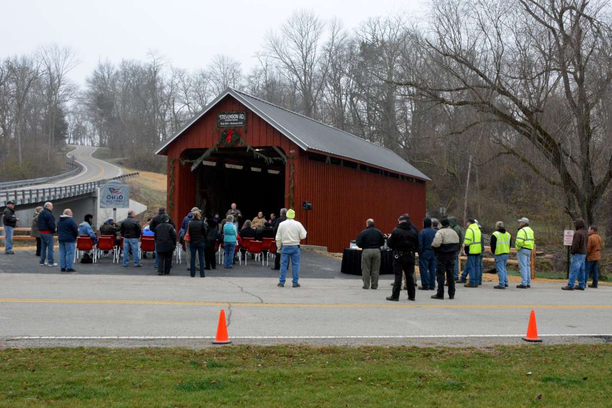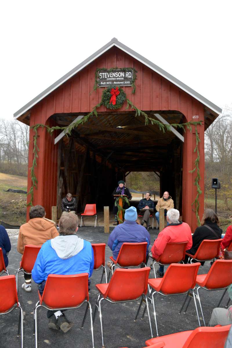 On December 3, 2015, Greene county held a dedication for the newly remodeled Stevenson Road Covered Bridge in Xenia Township (map). County Engineer Bob Geyer led the festivities and introductions: